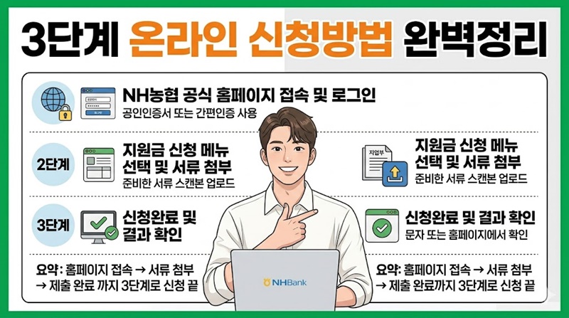 서류 제출 완료 후 신청 접수 문자가 발송되며, 심사 기간은 영업일 기준 약 5~10일 소요됩니다. 결과는 SMS 및 NH앱 알림으로 안내되며, 승인 시 지정 계좌로 직접 입금됩니다. 오프라인 신청을 원하실 경우 가까운 농협 지점을 방문하면 담당자가 직접 도와드립니다.