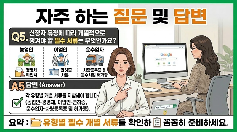 Q5. 신청자 유형에 따라 공통적으로 준비해야 하는 서류 외에 개별적으로 챙겨야 할 필수 서류는 무엇인가요? A5. 농업인은 경영체 확인서, 어업인은 면허증 사본, 운수업자는 차량등록증과 운수사업 허가증을 각각 준비해야 합니다.