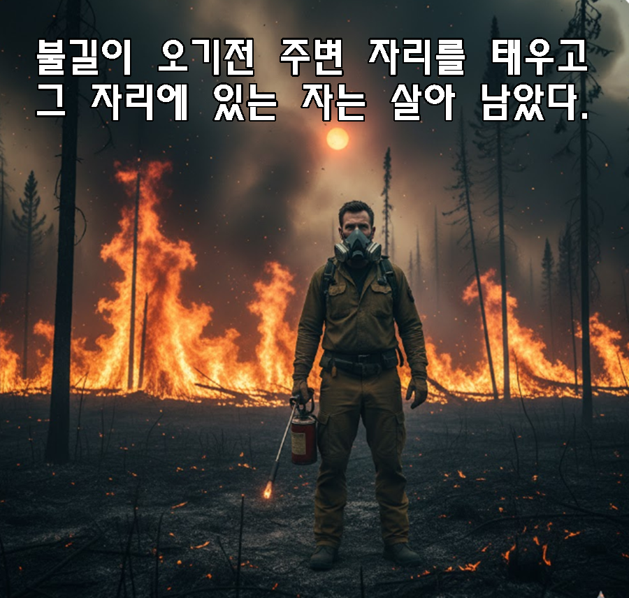 캐나다의 울창한 숲에서 거대한 산불을 만난 포수들의 이야기는 우리 영혼의 상태를 직관적으로 보여줍니다. 맹렬한 불길이 뒤쫓아올 때 인간의 힘으로 도망치는 것은 불가능하며, 높은 나무 위로 올라가는 인간적인 발버둥은 오히려 더 큰 화를 부를 뿐입니다. 이때 살 수 있는 유일한 방법은 미리 불을 놓아 태워버린 '맞불의 자리'로 들어가는 것인데, 영적으로 이 맞불의 자리가 바로 갈보리 십자가입니다.