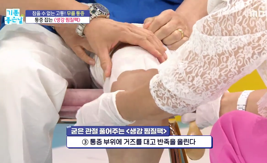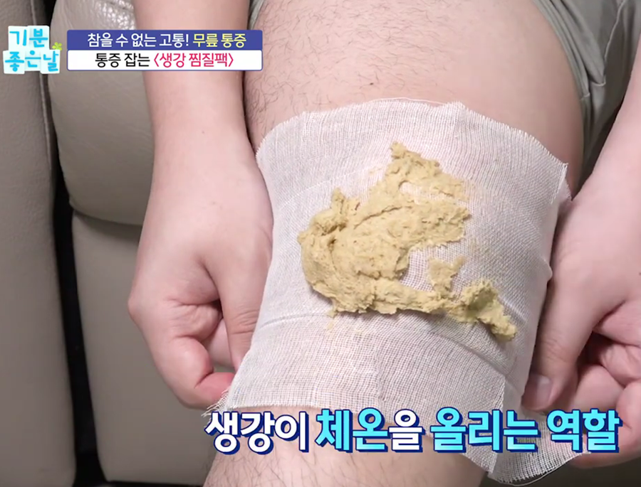 생강 200g을 곱게 갈아 면 주머니에 넣고 물 2L에 달인 후, 70℃ 정도로 식혀서 사용합니다. 면 수건을 이 생강물에 적셔 물기를 약간 짠 후, 찜질 부위에 덮고 그 위에 비닐랩과 마른 수건을 감싸 열이 새지 않도록 밀봉합니다. 1회에 10분씩, 하루 2회 정도 꾸준히 반복하는 것이 좋으며, 피부에 가려움이 느껴지면 즉시 농도를 묽게 희석해야 합니다.