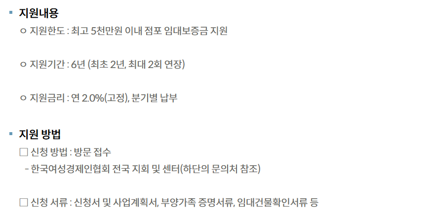 한국여성경제인협회는 여성 가장의 창업 및 경영 안정을 위해 점포 임대보증금을 무담보, 저금리로 지원한다. 지원 금액은 개인별 상황에 따라 다르지만, 통상적으로 수백만 원에서 수천만 원까지 지원받을 수 있다.