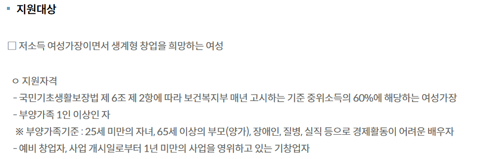 1) 여성 가장: 주민등록등본 상 배우자가 없거나, 배우자가 있어도 질병, 장애 등으로 경제활동이 어려운 여성