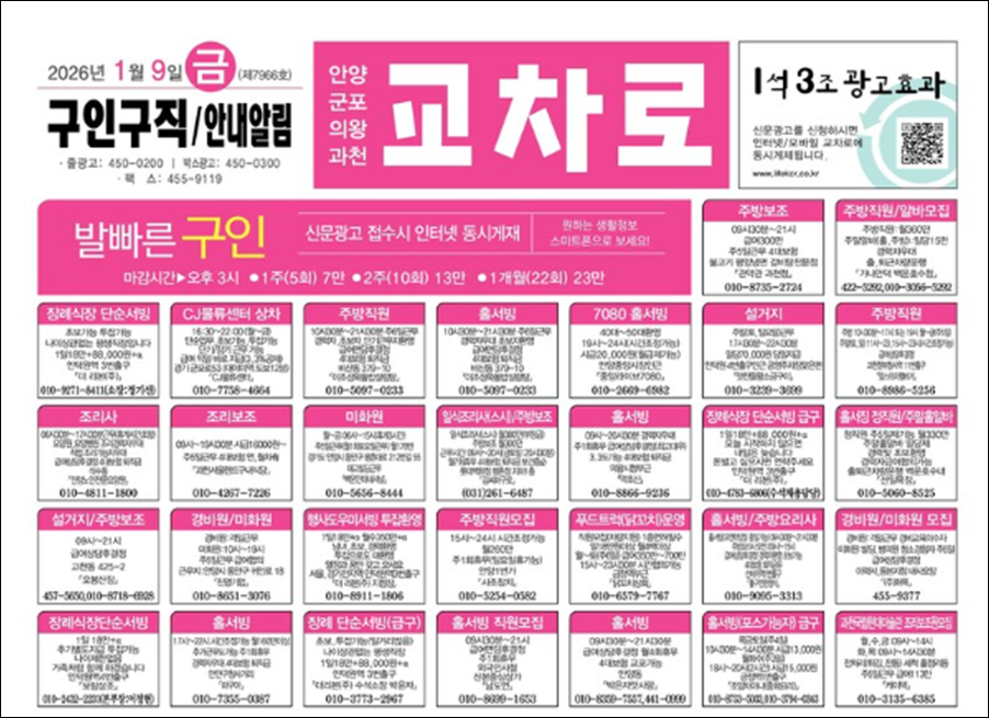 안양교차로는 매주 목요일 오전 9시에 새로운 구인공고가 업데이트됩니다. 온라인 웹사이트와 무료 인쇄물을 통해 안양 지역 중소기업부터 대기업 협력사까지 평균 200개 이상의 채용정보가 제공됩니다.