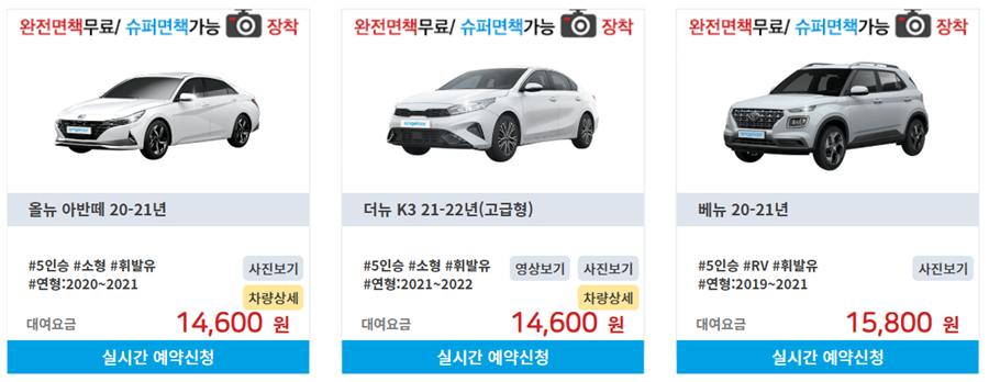 - 슈퍼면책(완전면책) 특약: 업계 최고 수준의 단독 사고 보장을 포함한 완전자차 특약(옵션)을 제공합니다. 타인과의 사고는 물론, 고객 과실로 인한 단독 사고까지 보장받아 렌터카 사고에 대한 모든 불안감을 떨쳐낼 수 있습니다. (전 차량 블랙박스 기본 장착은 덤이죠!)