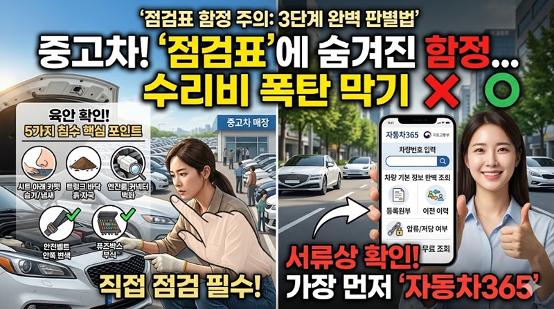 요약: 점검표 + 보험 이력 조회 + 실물 침수 확인, 이 3가지를 함께 해야 완벽한 중고차 구매가 됩니다.