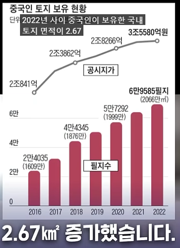 국토부의 자료에 따르면, 2017년부터 2022년 사이에 중국인이 보유한 토지 면적이 무려 2.67제곱킬로미터 증가했습니다. 이는 여의도 크기만큼의 땅이 중국인의 손에 넘어간 것과 같습니다.