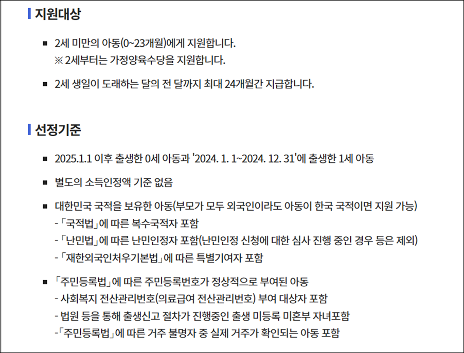 Q1. 2026년 기준으로 아이의 연령에 따라 매달 얼마를 받을 수 있나요? A1. 생후 0~11개월 아동은 월 110만 원, 12~23개월 아동은 월 55만 원을 받게 됩니다.