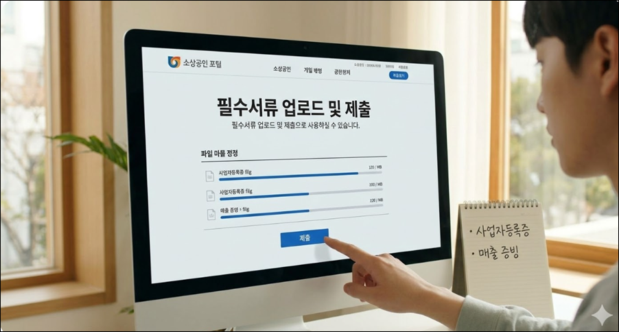 사업자등록증, 최근 3개월 매출 증빙자료, 재무제표를 PDF 또는 JPG 파일로 업로드하세요. 모든 서류 첨부 후 '제출하기'를 누르면 접수번호가 발급되며, 영업일 기준 7일 이내 심사 결과를 문자로 받을 수 있습니다.