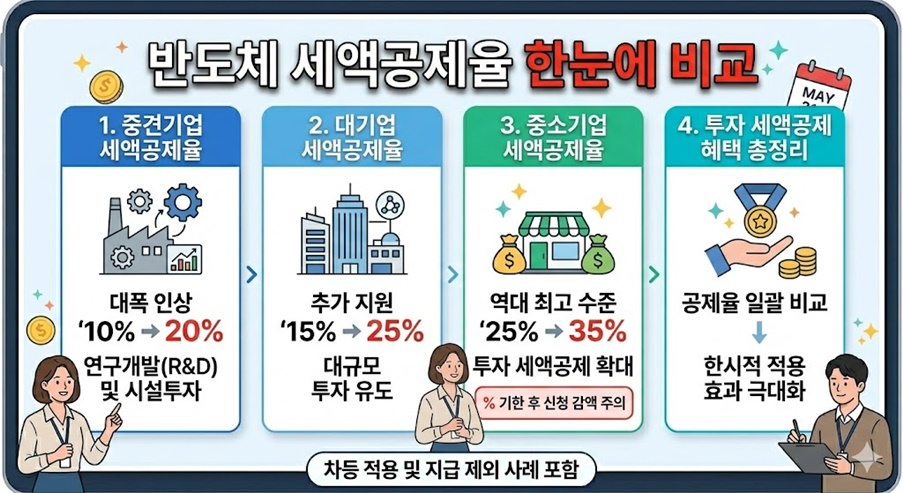 아래 표는 기업 규모별·항목별 반도체 관련 세액공제율을 정리한 것입니다. 공제율은 「조세특례제한법」 기준이며, 추가 임시투자세액공제 적용 여부에 따라 실제 수혜율이 달라질 수 있습니다.