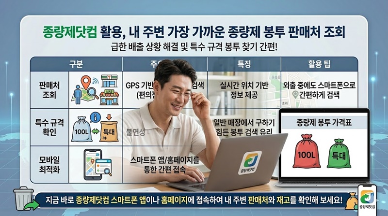 급하게 쓰레기를 버려야 하는데 봉투가 떨어졌다면, 헤매지 말고 종량제닷컴 서비스를 활용해 보시는 것을 적극 추천합니다. 이 사이트는 단순 가격 정보뿐만 아니라 GPS 기반으로 현재 내 위치에서 가장 가까운 편의점, 마트, 슈퍼마켓 정보를 제공합니다.